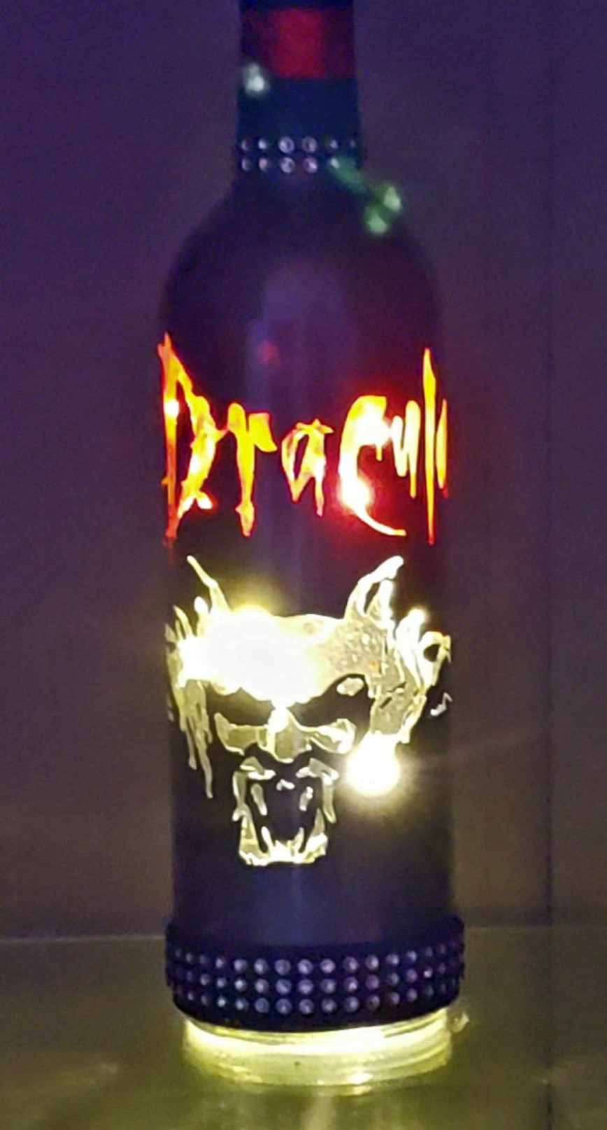 Hand painted 750ml wine bottle. Battery operated. All orders include extra lights and batteries.