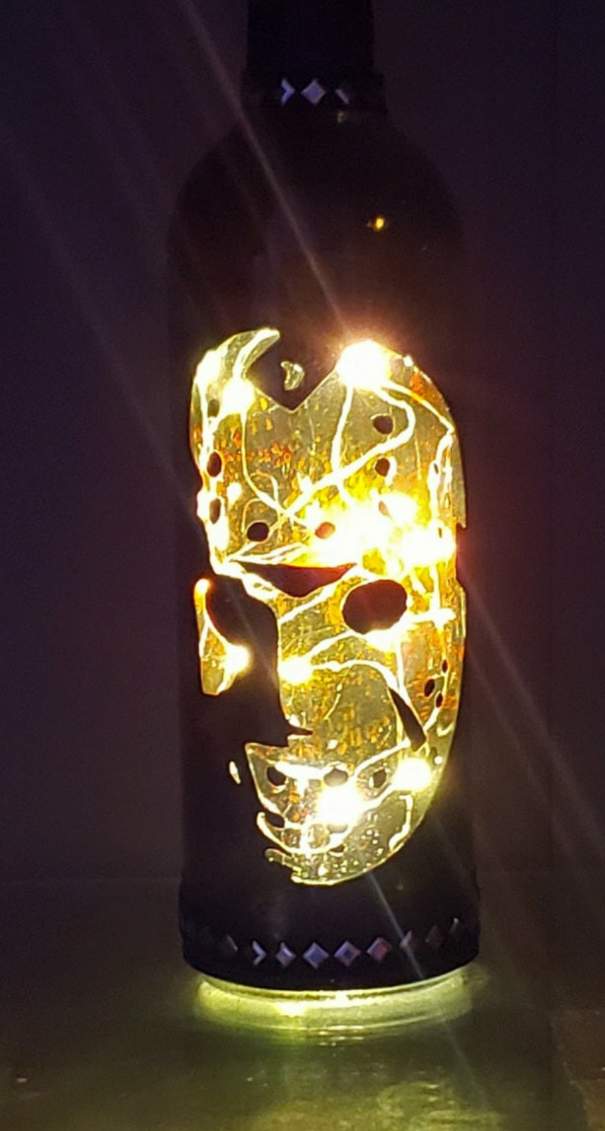 Hand painted 750ml wine bottle. Battery operated. All orders include extra lights and batteries.